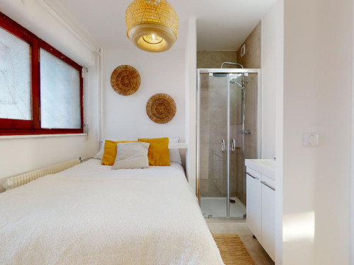 Chambre avec salle d'eau privative, un lit double, un bureau et une armoire.